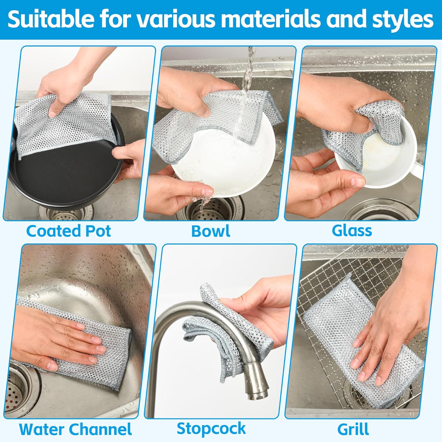 12Pack Multipurpose Wire Dishwashing Rags, Upgrade Non Scratch Wire Dishcloth, Silver Mesh Dish Cloths, Reusable Metal Mesh Cleaning Cloths, Steel Scrub Rags for Kitchen/Stove/Oven/Bath