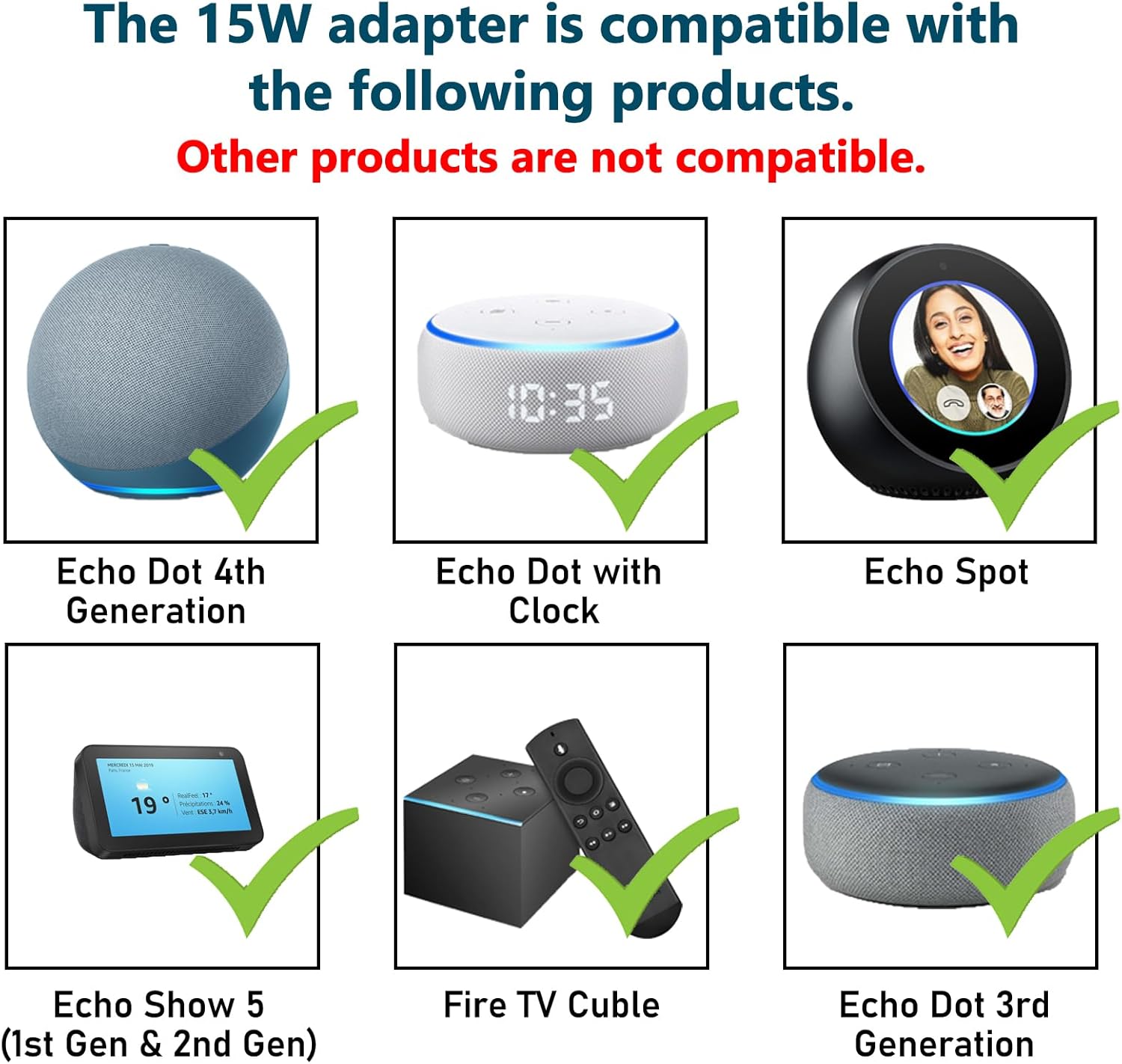 【COMPATIBILITY】:Power adapter compatible with the Echo Dot 4th Generation, Echo Dot 3rdGeneration, Fire TV Cubte, Echo Show 5 (1st Gen & 2nd Gen), Echo Spot and Echo Dot with Clpck.