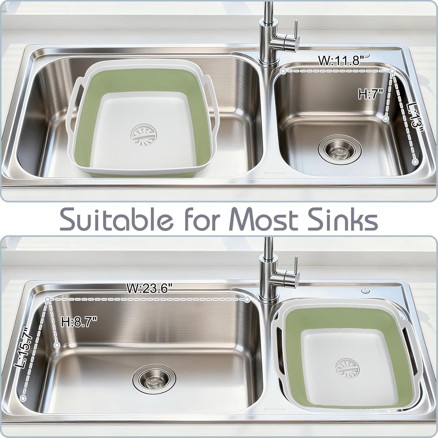 【Space-Saving and Foldable】The dish basin feature a foldable design so that you can adjust the size as needed. It collapses easily for storage and takes up very little space.Expanded size:12.4 x 12 x 7.9(h) inches.Collapsed:2.8 inches. The Interior bottom dimension is about 10.1 x 10.1 inches. Capacity: 9L / 2.4 gallon