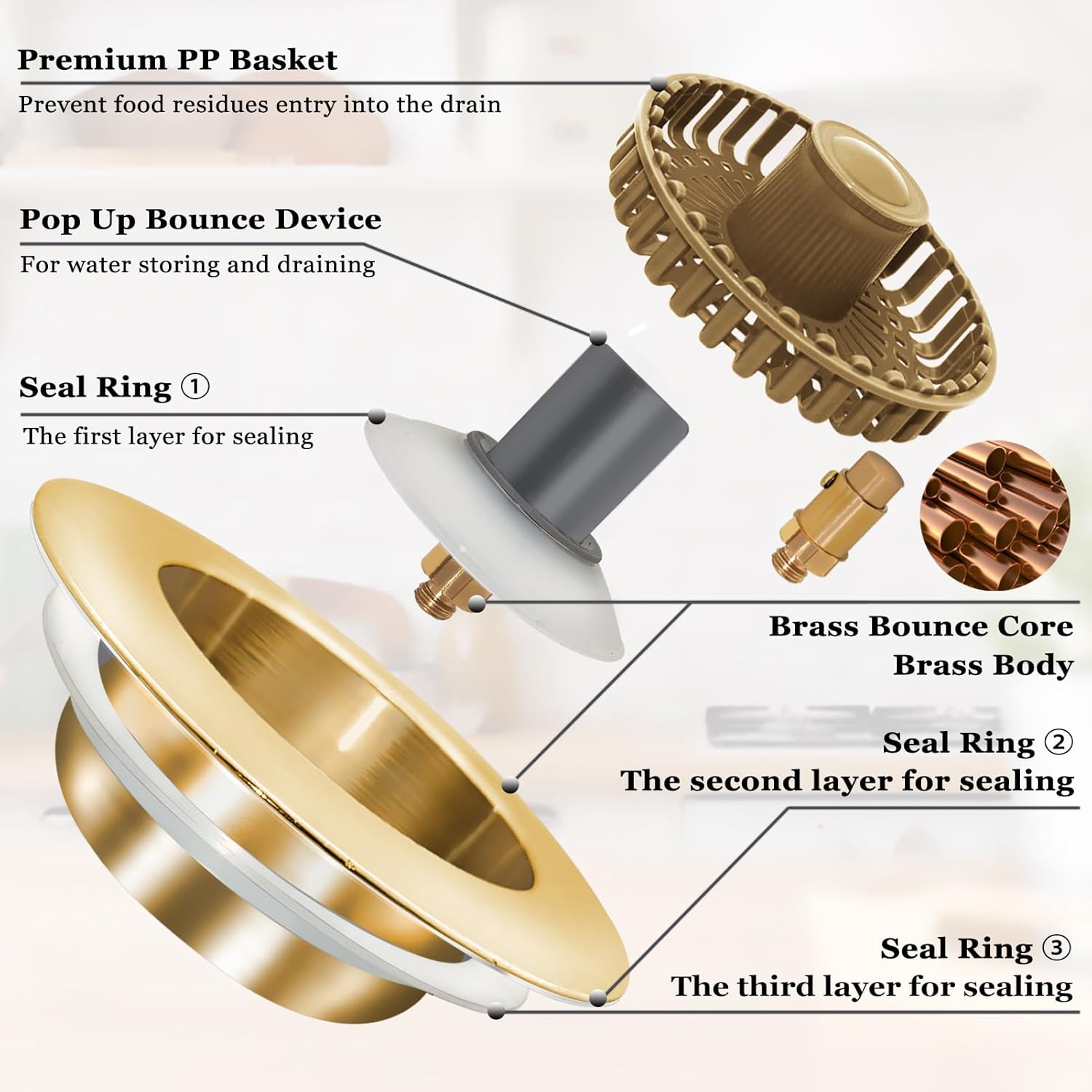 [Upgraded Brass Material] Sink stopper kitchen drain, is consists of Brass, electroplating body and ABS material plastic sink strainer basket, which is more durable.(Comes with an additional ABS plastic anti-clogging strainer basket.)