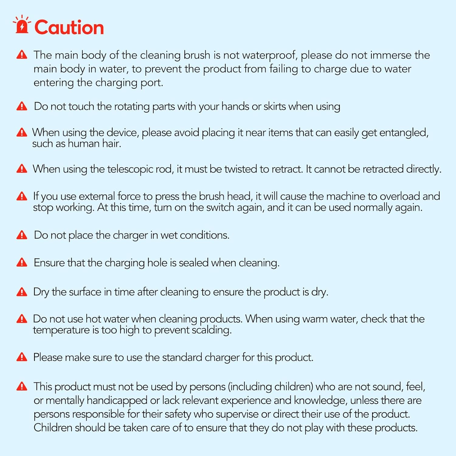 Please do not immerse the main body in water, to prevent the product from failing to charge due to water entering the charging port. Do not touch the rotating parts with your hands or skirts when using. When using the device, please avoid placing it near items that can easily get entangled, such as human hair. When using the telescopic rod, it must be twisted to retract. It cannot be retracted directly. Children should be taken care of to ensure that they do not play with the product