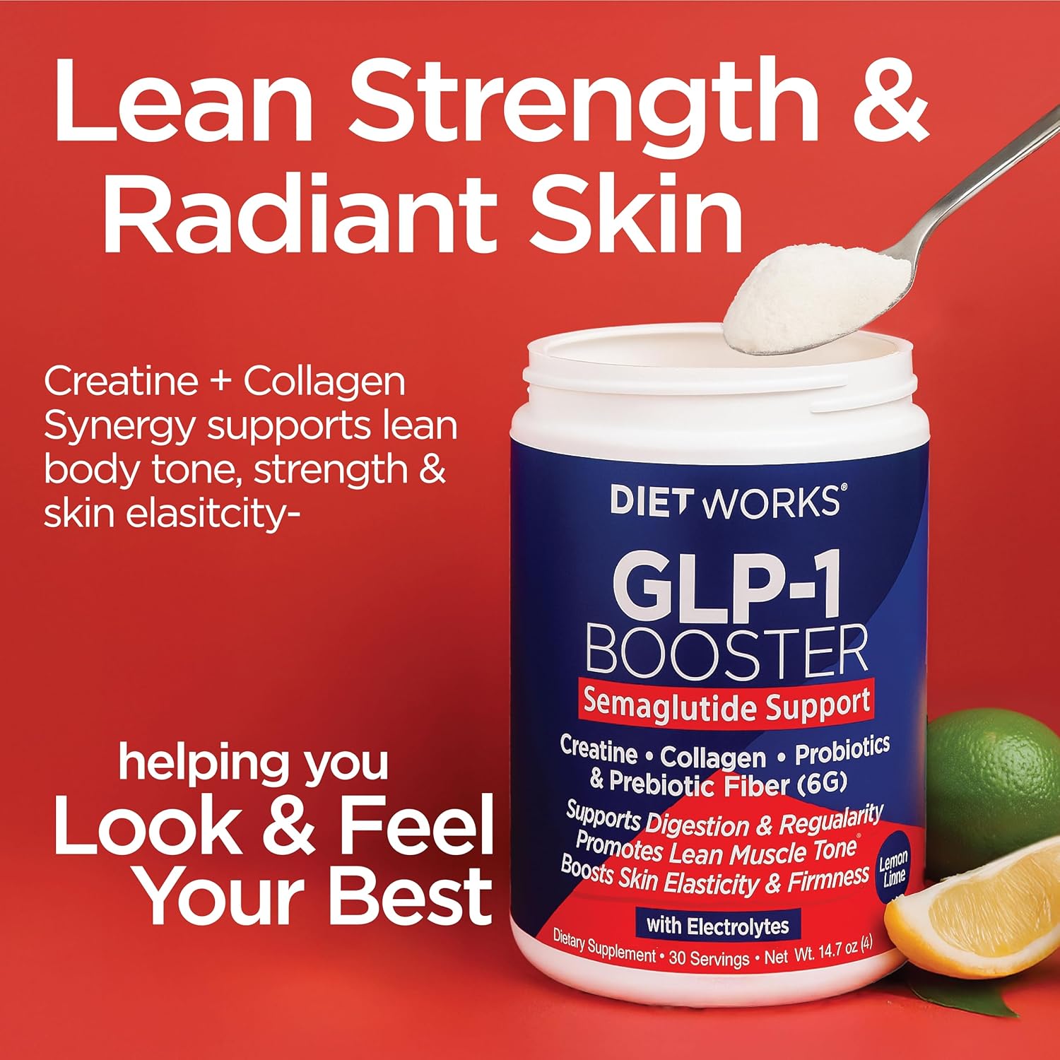 CREATINE + COLLAGEN SYNERGY. The innovative blend in DietWorks Booster helps support lean body tone and skin elasticity—ideal for active individuals looking to maintain strength and confidence.