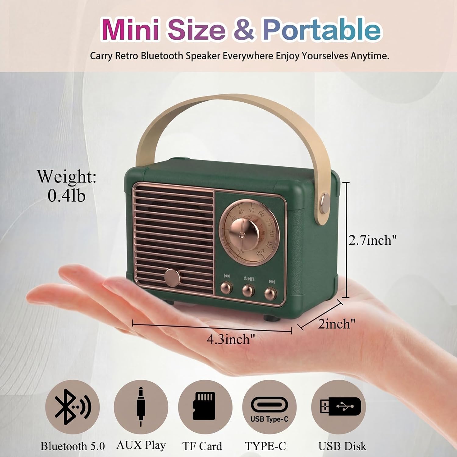 【 Bluetooth 5.0 technology& Crystal Clear Sound】: Equipped with advanced technology, compatible for all Bluetooth iPhone iPad Tablet .With the advanced Bluetooth5.0 technology, maintain a strong connection up to 32.8ft this retro Bluetooth speaker could connect with your smart equipment in less than one second.Cute Stereo Ultra mini but super loud. Whether you listen to country music, rock music or popular music, it will let you feel at the real concert scene.