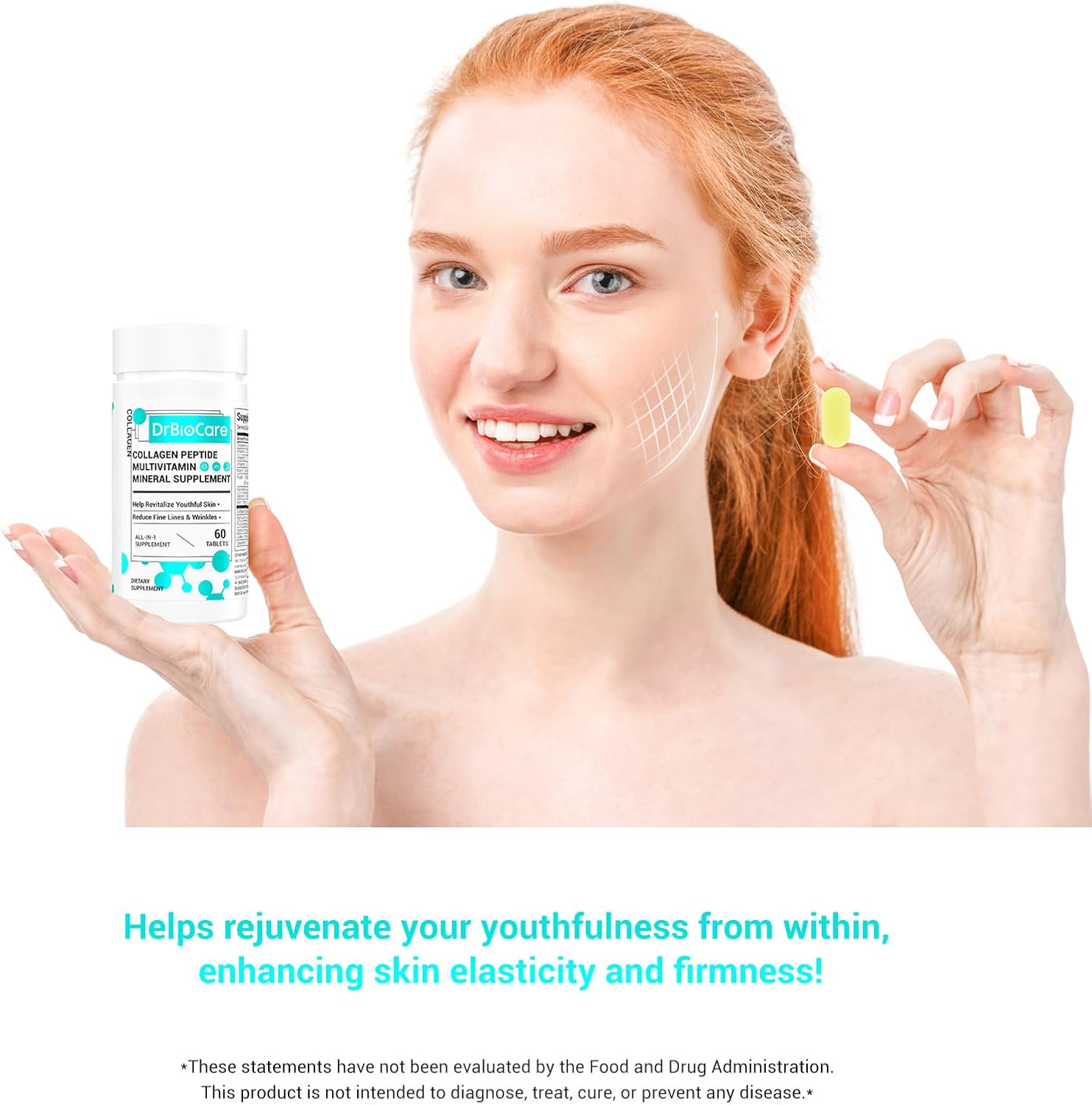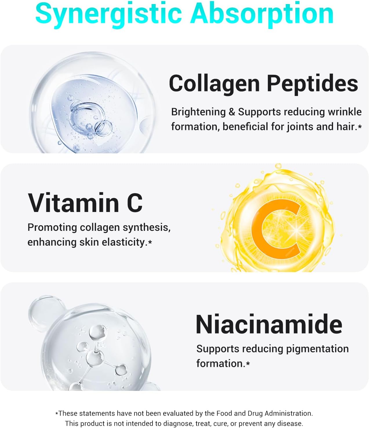 Collagen Peptides: Supports enhances skin elasticity; increases collagen synthesis, improves skin elasticity.