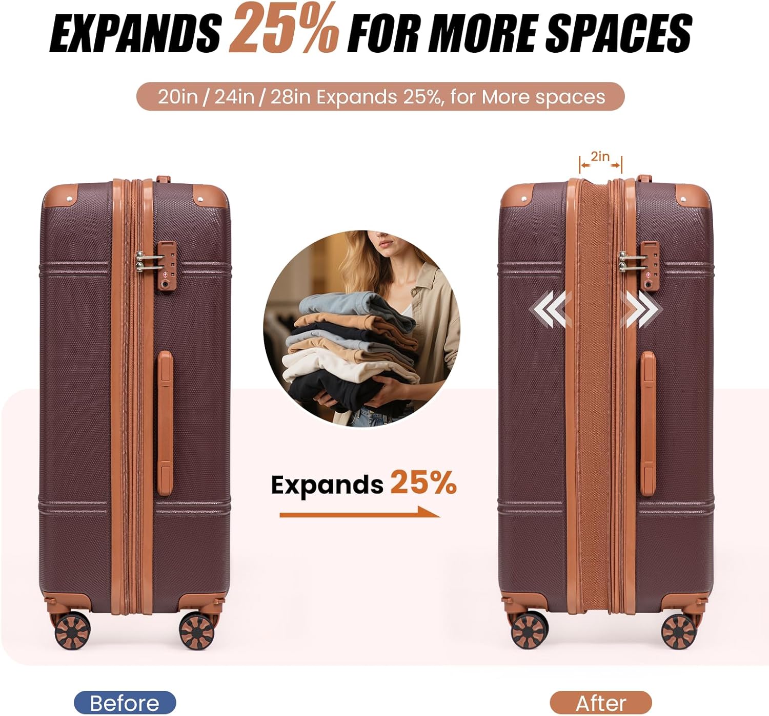 【Expandable Design for Extra Capacity】The 20″24″ and 28″ suitcases include an expandable zipper (2 inch),25% more storage space,that provides extra packing space when needed—perfect for souvenirs, extra clothing, or long journeys.