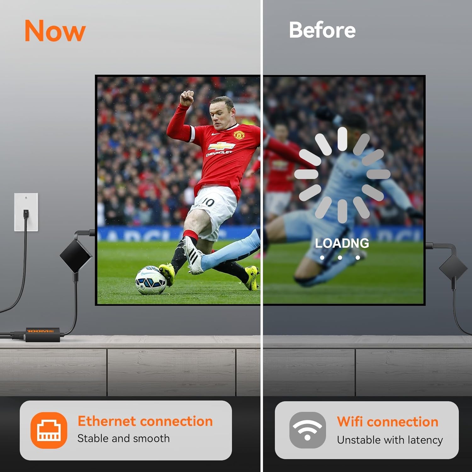 Plug-and-Play Instant Activation: No drivers or complex configurations needed—simply connect the Ethernet adapter to your 100 Mbps Fire Stick’s Micro USB port and plug in an Ethernet cable from your router. For optimal power supply, use the included Micro USB power cable (recommended for stable performance).