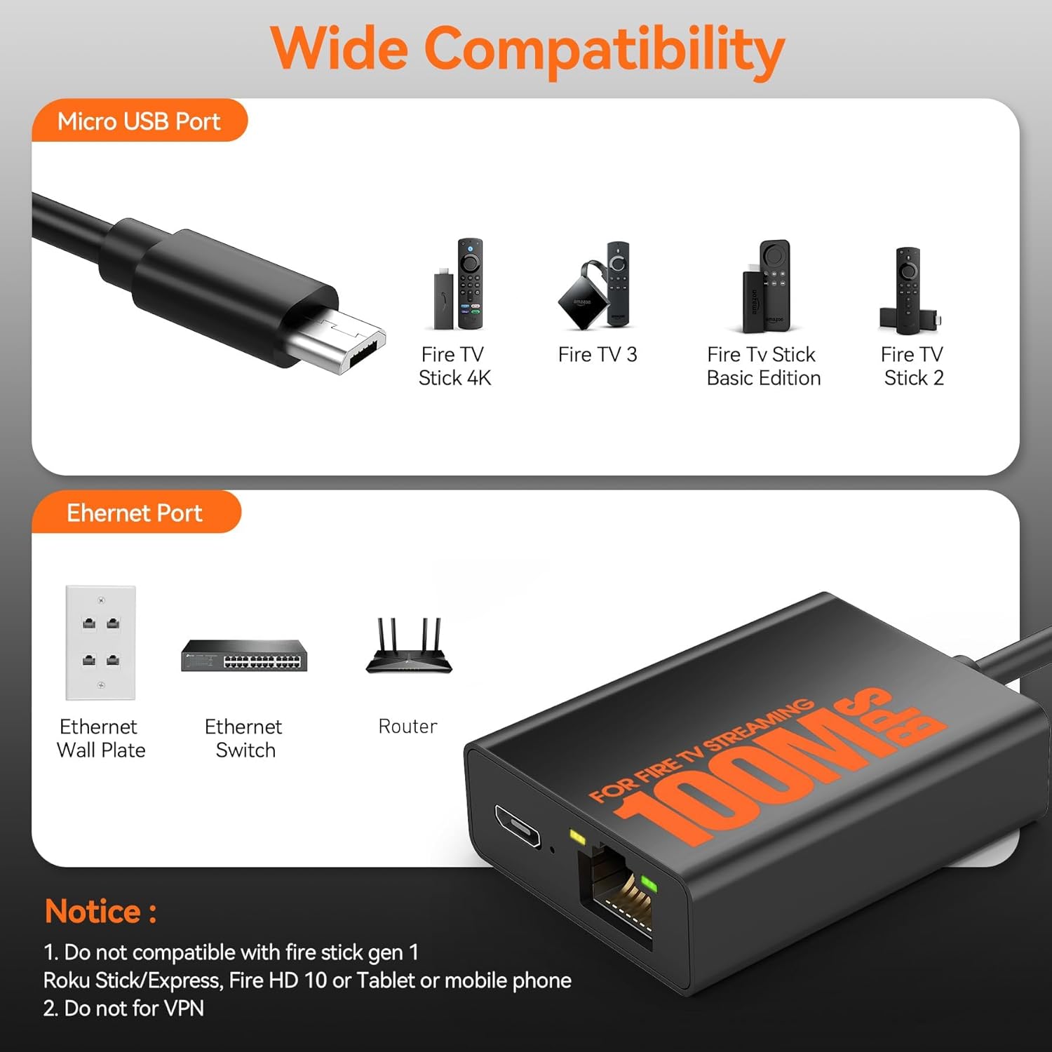 Enhanced Compatibility & Performance: Optimized TV stick ethernet adapter, seamlessly connects with Fire TV Stick 2/3/4K/4K MAX, Google Home Mini, Chromecast Ultra / 3 / 2 / 1 / Audio, Raspberry Pi Zero and more. Smart tips: 1, Supporting Ethernet through the TV stick which is Micro USB port; 2, NOT compatible with fire TV stick gen 1 (FCCID: 2ABDU-0509), Roku Stick/Express, Fire HD 10 or tablet or cellphone; 3,Do not fit for VPN.