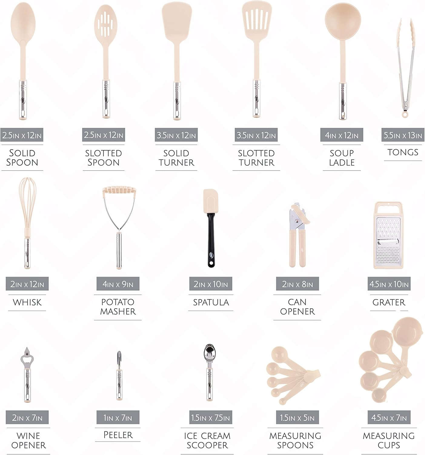 Cooking Utensils Set Includes: Soup Ladle, Solid Spoon, Slotted Spoon, Solid Turner, Slotted Turner, Potato Pusher, Whisk, Can Opener, Grater, Spatula, Tongs, Ice Scream Scooper, Wine Opener, Peeler, Measuring Cups, Measuring Spoons.