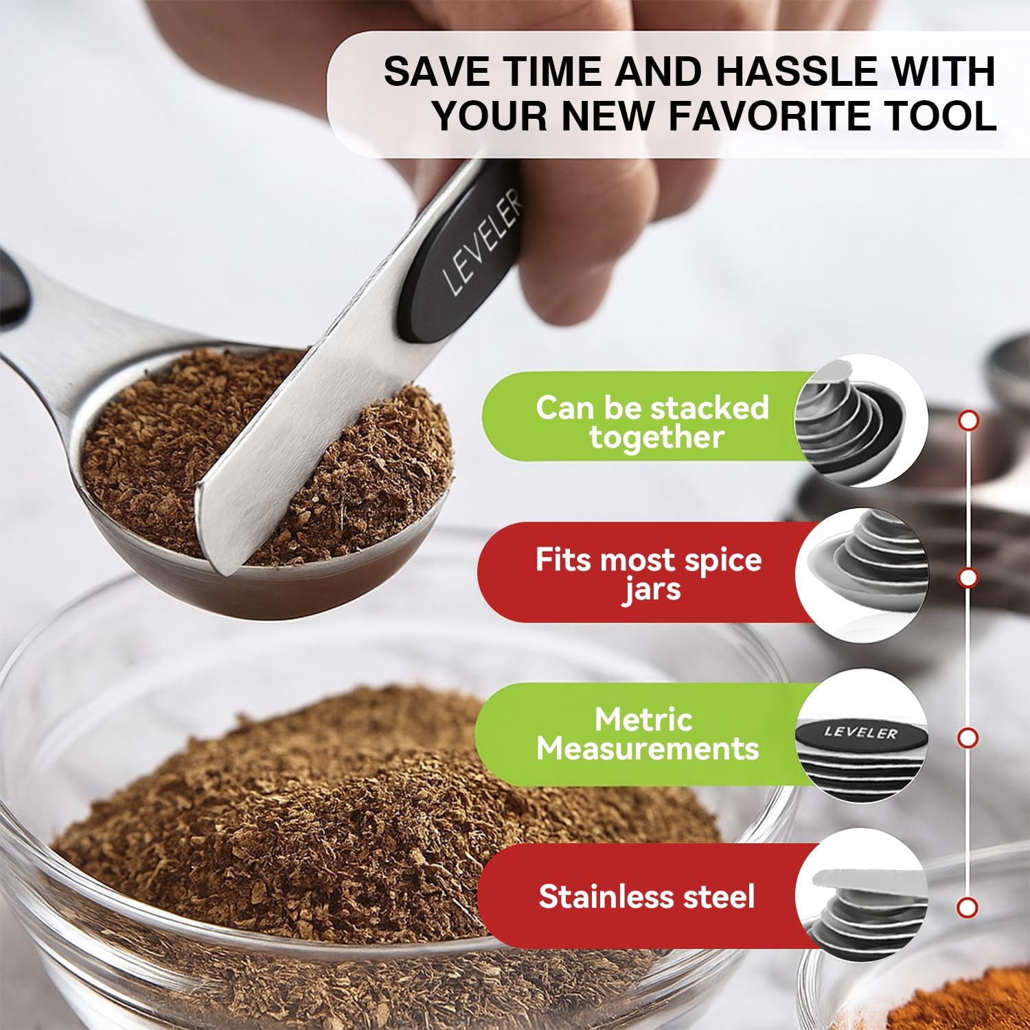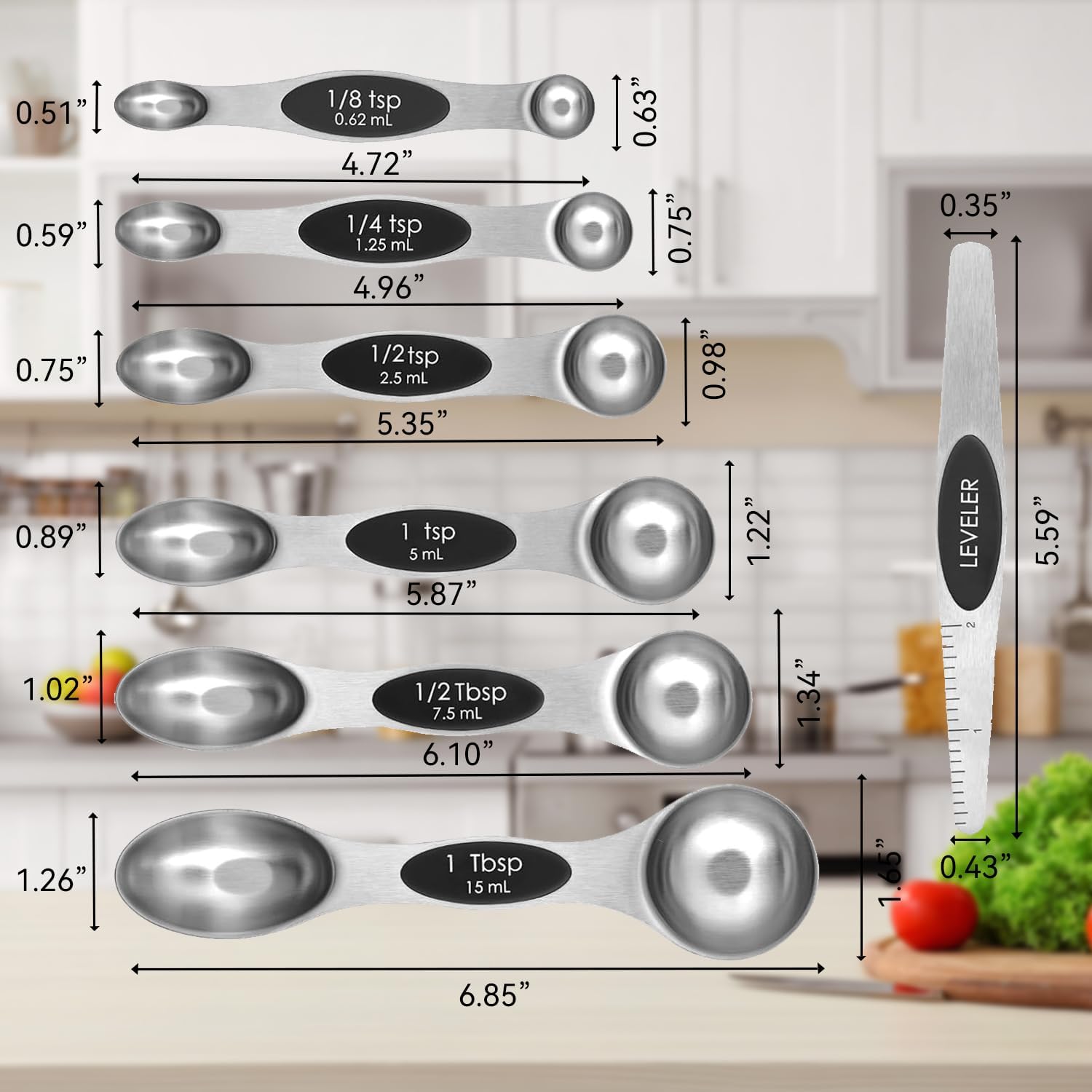 Magnetic Measuring Spoons Set with Strong N45 Magnets, Heavy Duty Stainless Steel Metal, Fits in Most Kitchen Spice Jars for Baking & Cooking, BPA Free, Set of 7 with Leveler, Black