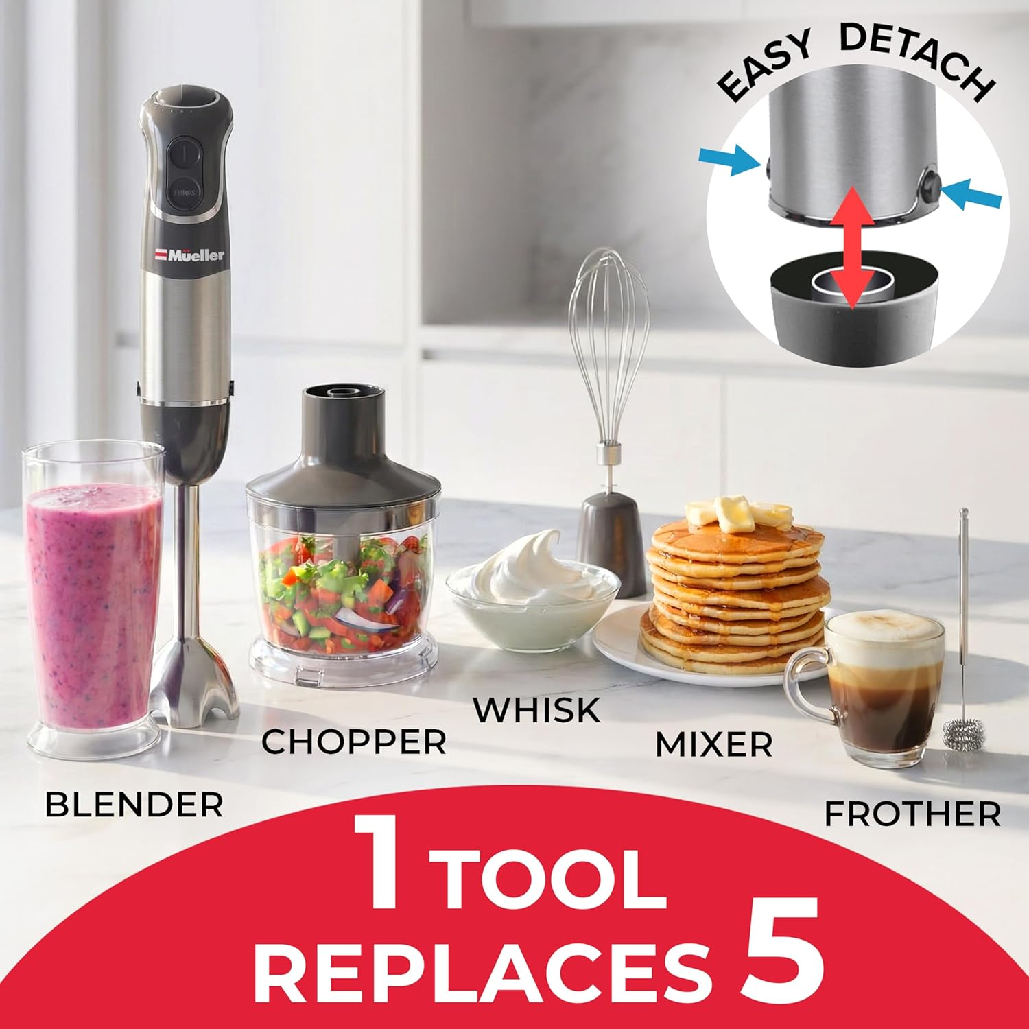 MULTI-FUNCTIONAL MASTERY – Beyond blending, our comprehensive set includes a Snap-on Whisk attachment, Frother attachment, Beaker (20 fl. oz) and Twist and Lock Chopper (16oz) with removable blade, redefining the 5-in-1 kitchen appliance concept. The chopper acts as your mini food processor with the perfect lid to eliminate mess and tearing eyes when chopping white or red onions!