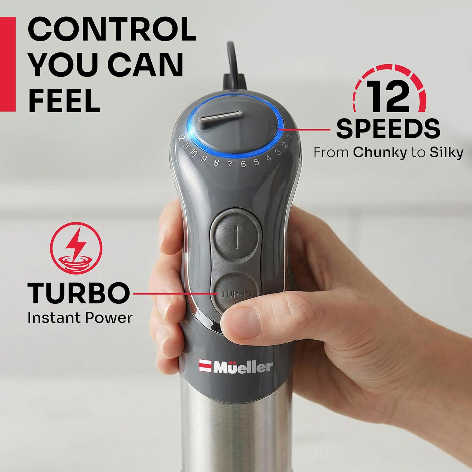 The Multistick Hand blender features a 800W with 12 speed options and turbo mode. Blend delicate sauces or chunky soups in no time.