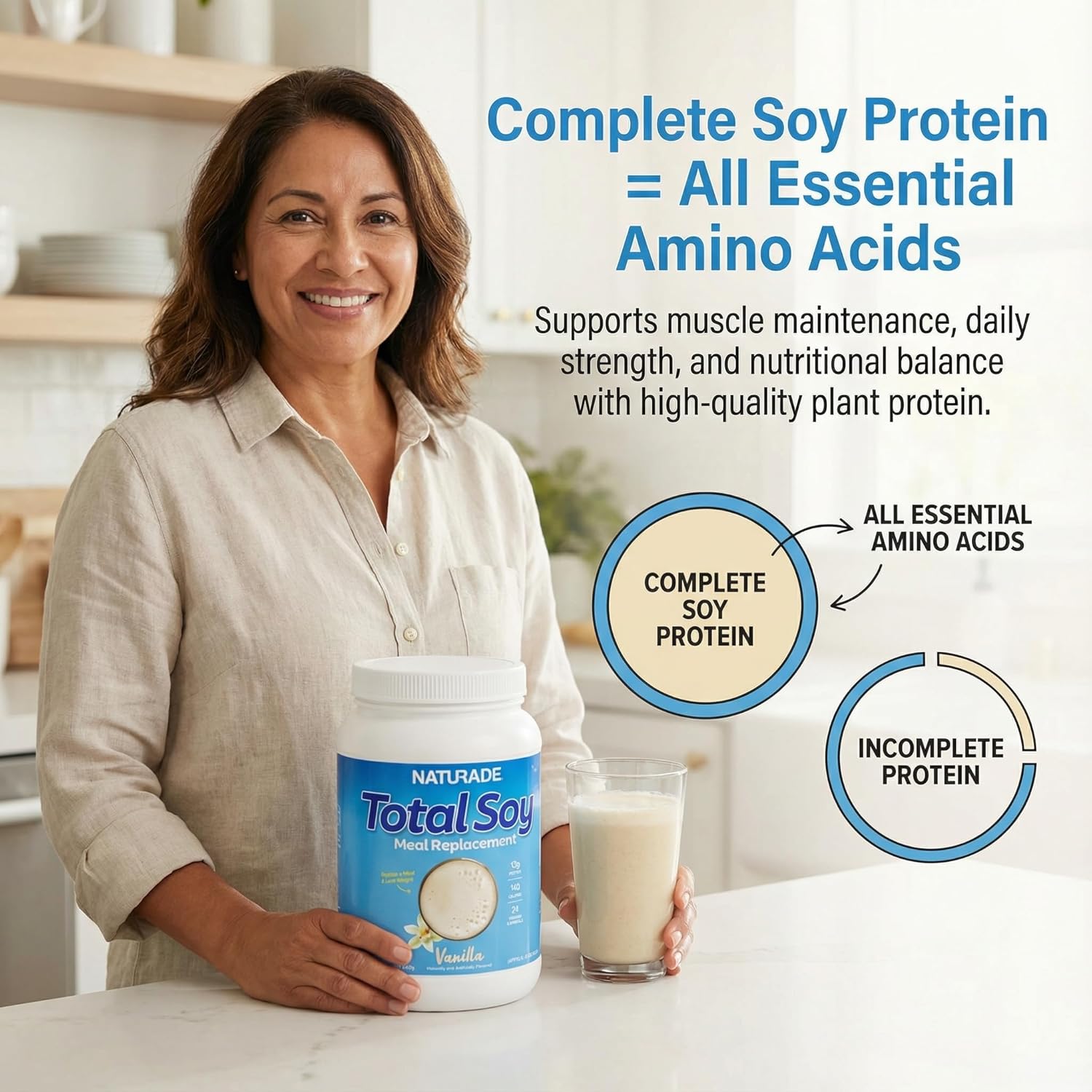 Complete Plant Protein for Your Wellness: Total Soy provides complete soy protein with all essential amino acids, supporting muscle maintenance, daily strength, and balanced nutrition through every stage of a woman’s life