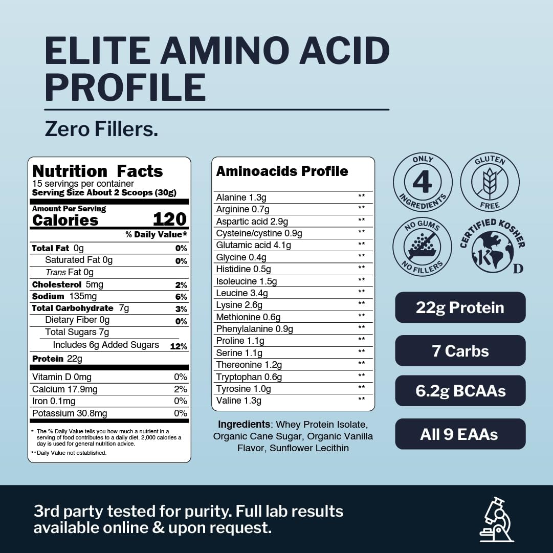 Our Vanilla Whey Isolate is 99% pure, with most fat and lactose removed. Leaner and easier to digest than standard concentrates, it offers high protein per calorie, smooth texture, and clean flavor without fillers, creamers, or thickeners.