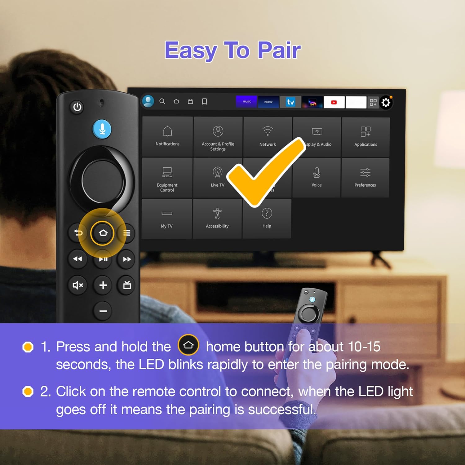 【HOW TO PAIR】:Please pair and replace the voice remote control before use. Press and hold the Home key for 10 to 15 seconds until the LED flashes rapidly, then release it. Wait for 30 to 60 seconds (at this point, the pairing mode is entered and the LED keeps flashing), and the remote control will automatically connect