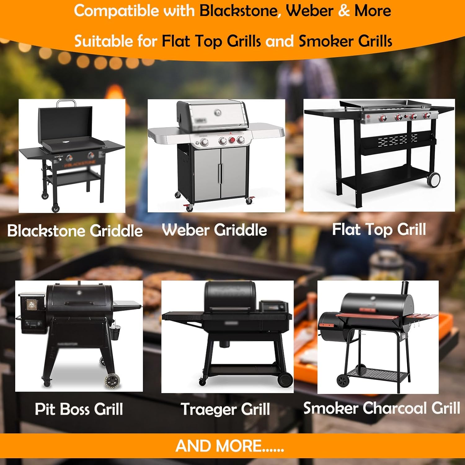 【High Compatibility & Large Size】 Compatible with a wide range of Blackstone and Weber grills, and suitable for smoker grills and flat top grills with side shelf from multiple brands. Our silicone spatula mat measures a generous 16×11.5 inches, providing ample space for organizing utensils, grill BBQ caddy seasoning jars, and keeping your cooking area tidy.