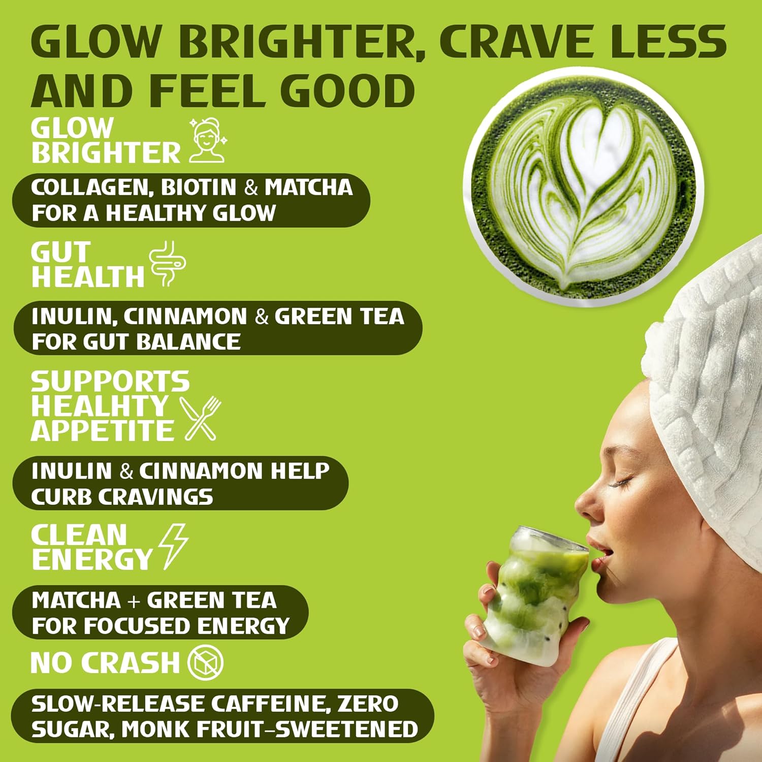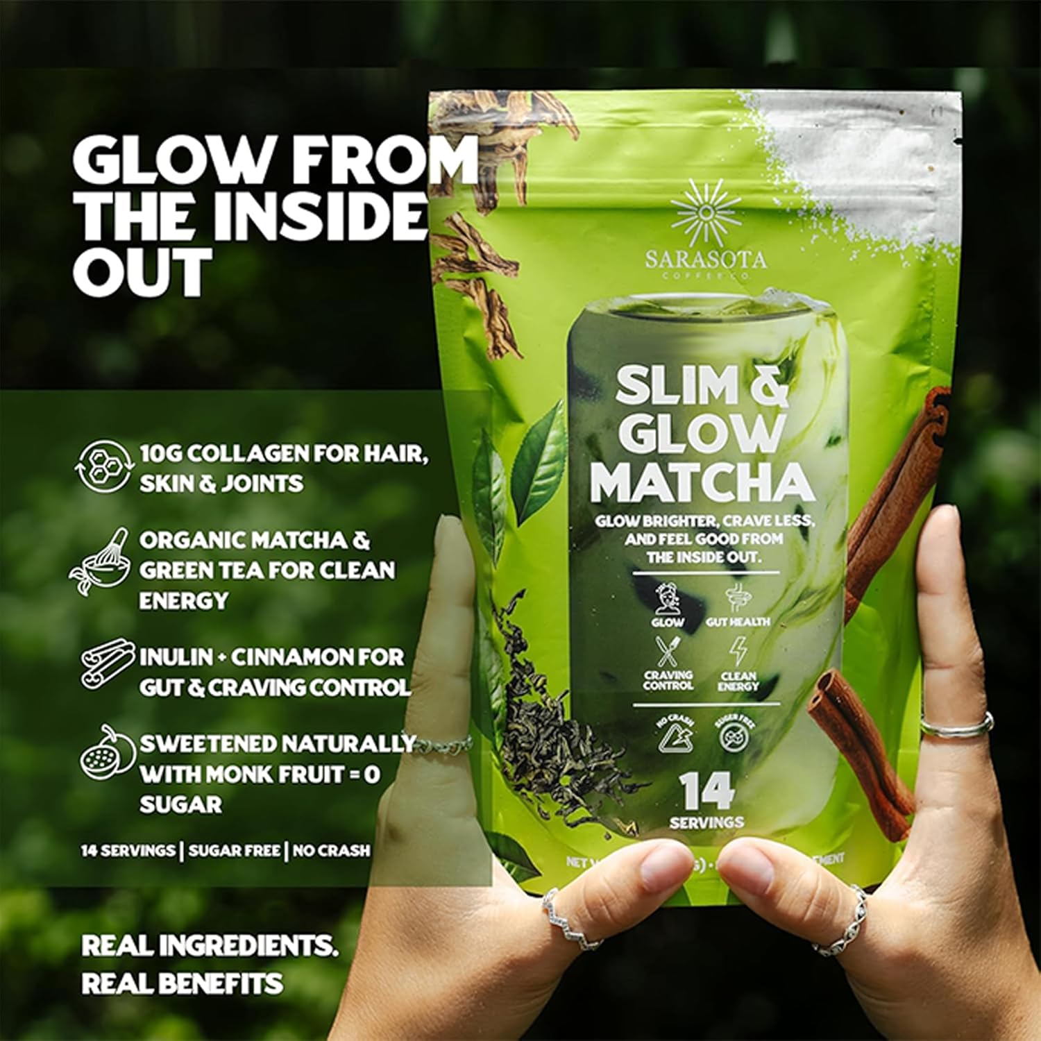 Slim & Glow Matcha Latte Powder – Collagen Peptides, Organic Matcha, Inulin Prebiotic Fiber, Green Tea Extract, Biotin – Gut Health, Craving Control – 14 Servings