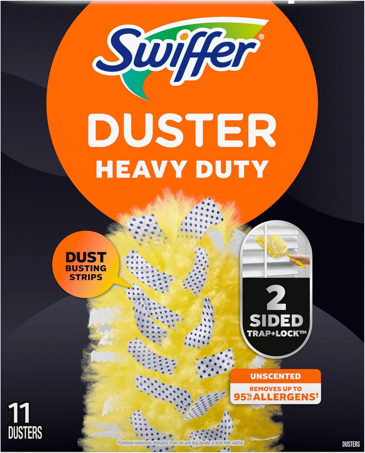 SWIFFER HEAVY DUTY DUSTER REFILLS pick up 5X MORE* dust & allergens.** Heavy Duty Duster has DUST-BUSTING STRIPS to break down layers of built-up dust, and thousands of fluffy, SPECIALLY-COATED FIBERS that grab onto dust in every direction and don’t let go. 360° DESIGN makes it easy to clean hard-to-reach places, like blinds and around knickknacks. *vs. feather duster after 9 uses **common inanimate allergens from cat and dog dander & dust mite matter