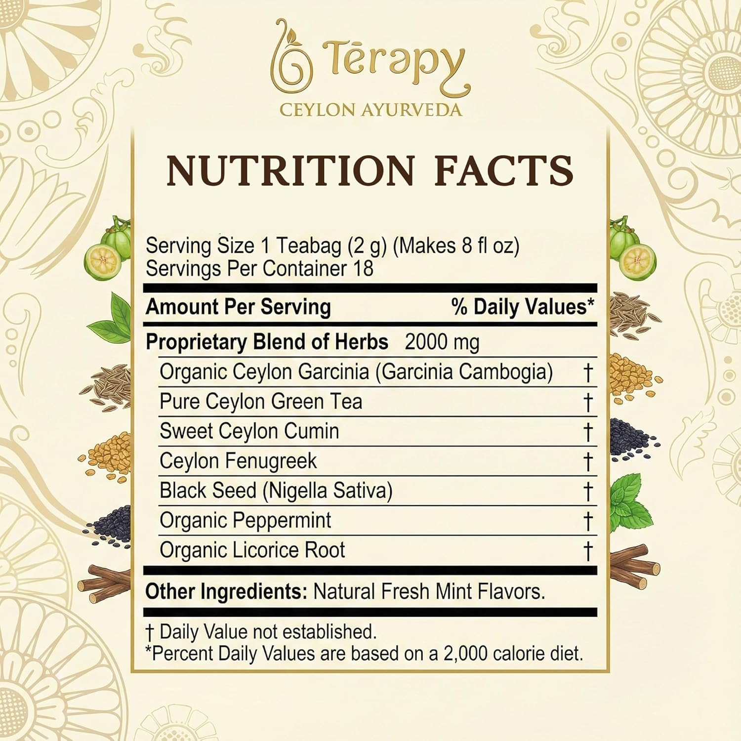 PREMIUM AYURVEDIC SLIMMING TEA: TERAPY Ceylon All Day Slimming Tea combines ancient Ayurvedic wisdom with organic Garcinia Cambogia, peppermint, green tea, ginger root, and licorice to naturally support metabolism, weight management, flat belly goals, tummy wellness, and overall vitality. This herbal tea promotes healthy digestion and a daily wellness ritual.