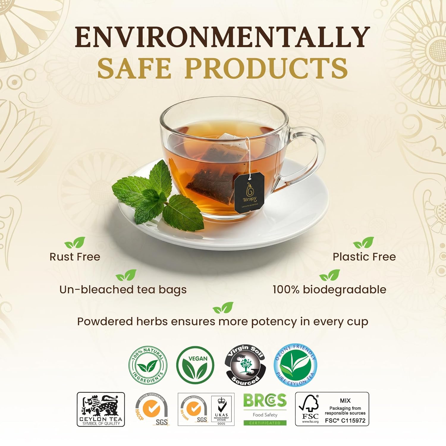 ORGANIC INGREDIENTS & NATURAL BLEND: Made from organic herbal ingredients including Garcinia Cambogia, peppermint, green tea, ginger root, black seed, and licorice. TERAPY Ceylon Slimming Tea is vegan, gluten-free, and sustainably packaged in eco-friendly, unbleached, compostable individually wrapped bags to preserve flavor and nutrition.