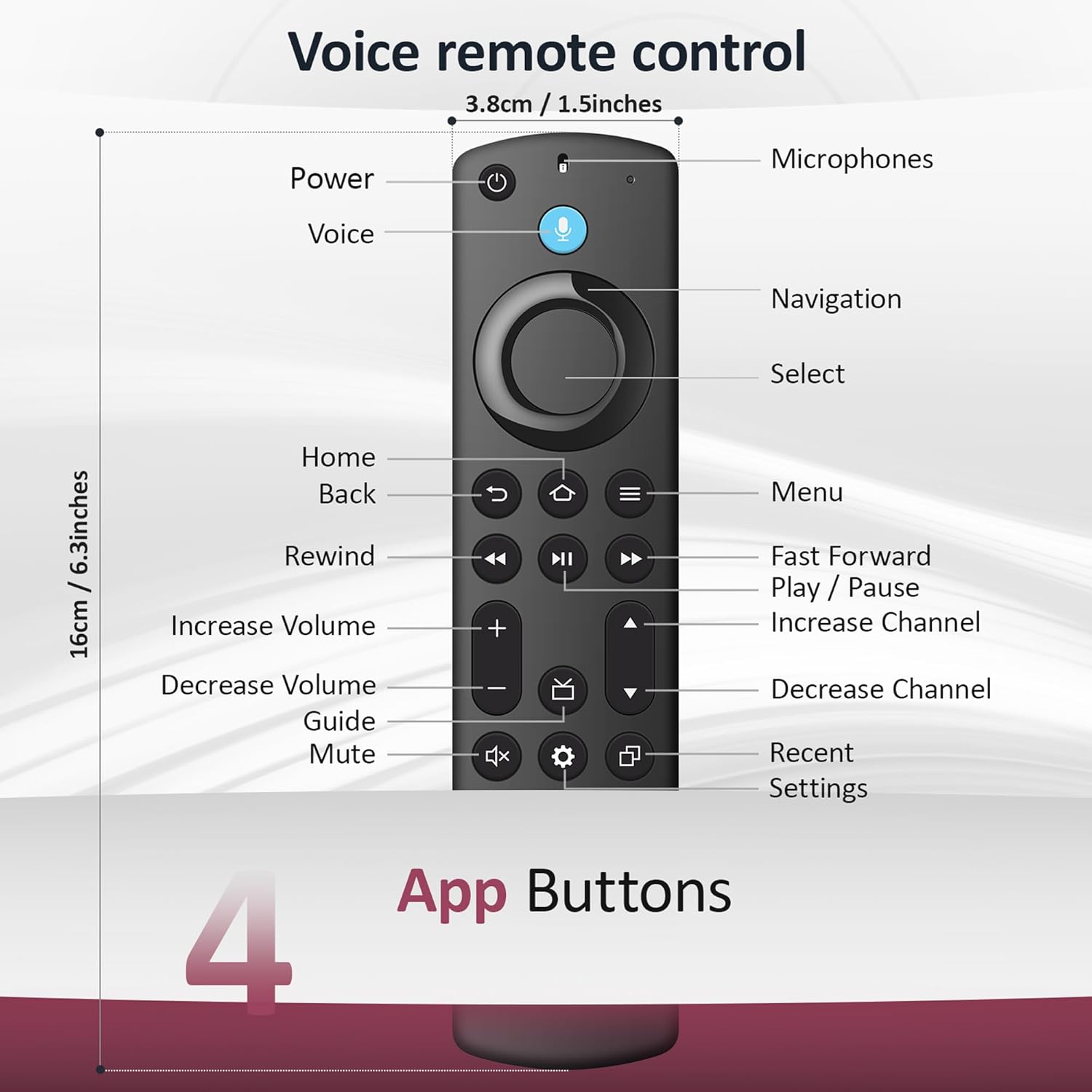 Voice Control Made Simple: Summon content with just your voice — search for shows, movies, or actors effortlessly. Use standard navigation keys to skip or replay scenes, and take advantage of four one-touch app shortcuts for instant access to your go-to streaming platforms