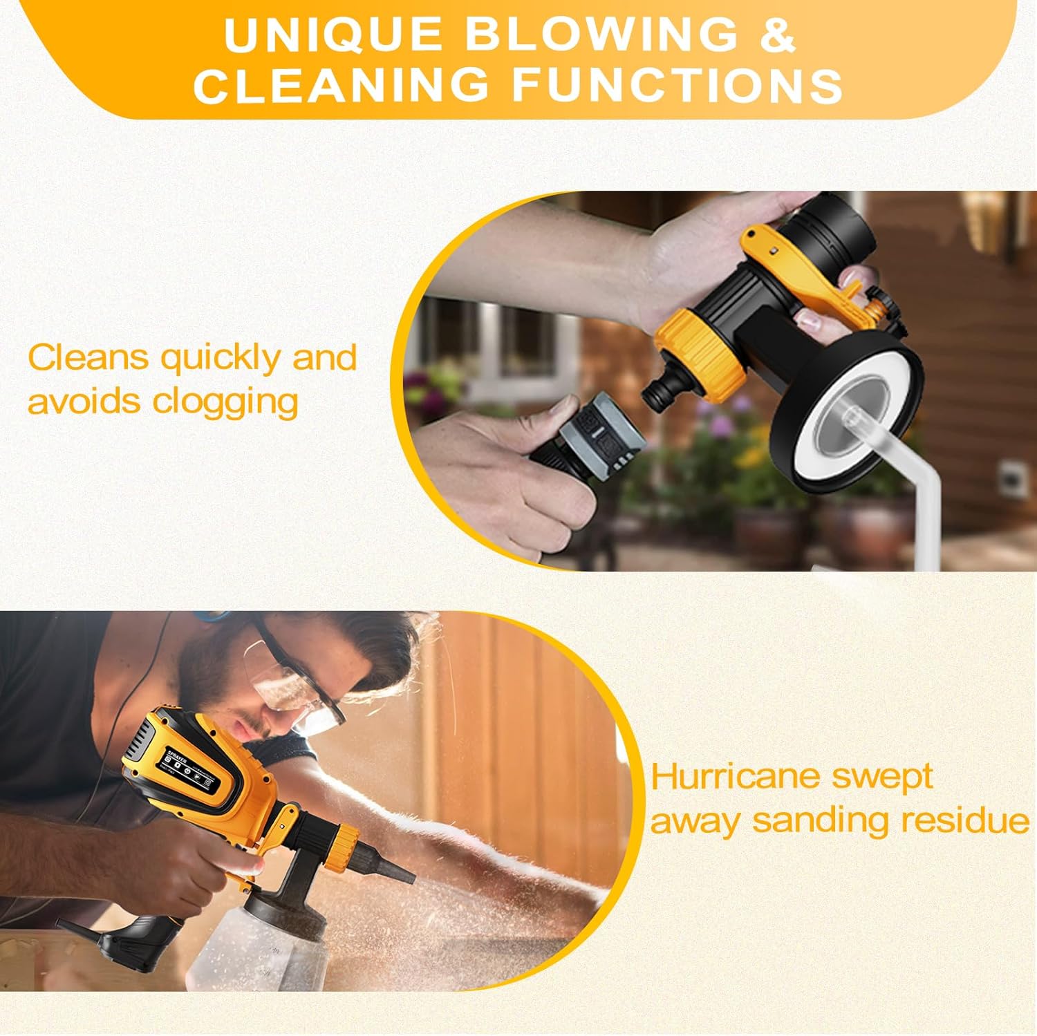 【Unique Blowing & Cleaning Functions】Before spraying, you can use the dust blowing joint with the paint sprayer to blow away the dust/debris on the surface to get a better surface spraying effect. After spraying, connect the cleaning connector to the faucet to clean the residual paint inside the pipe for easy cleaning