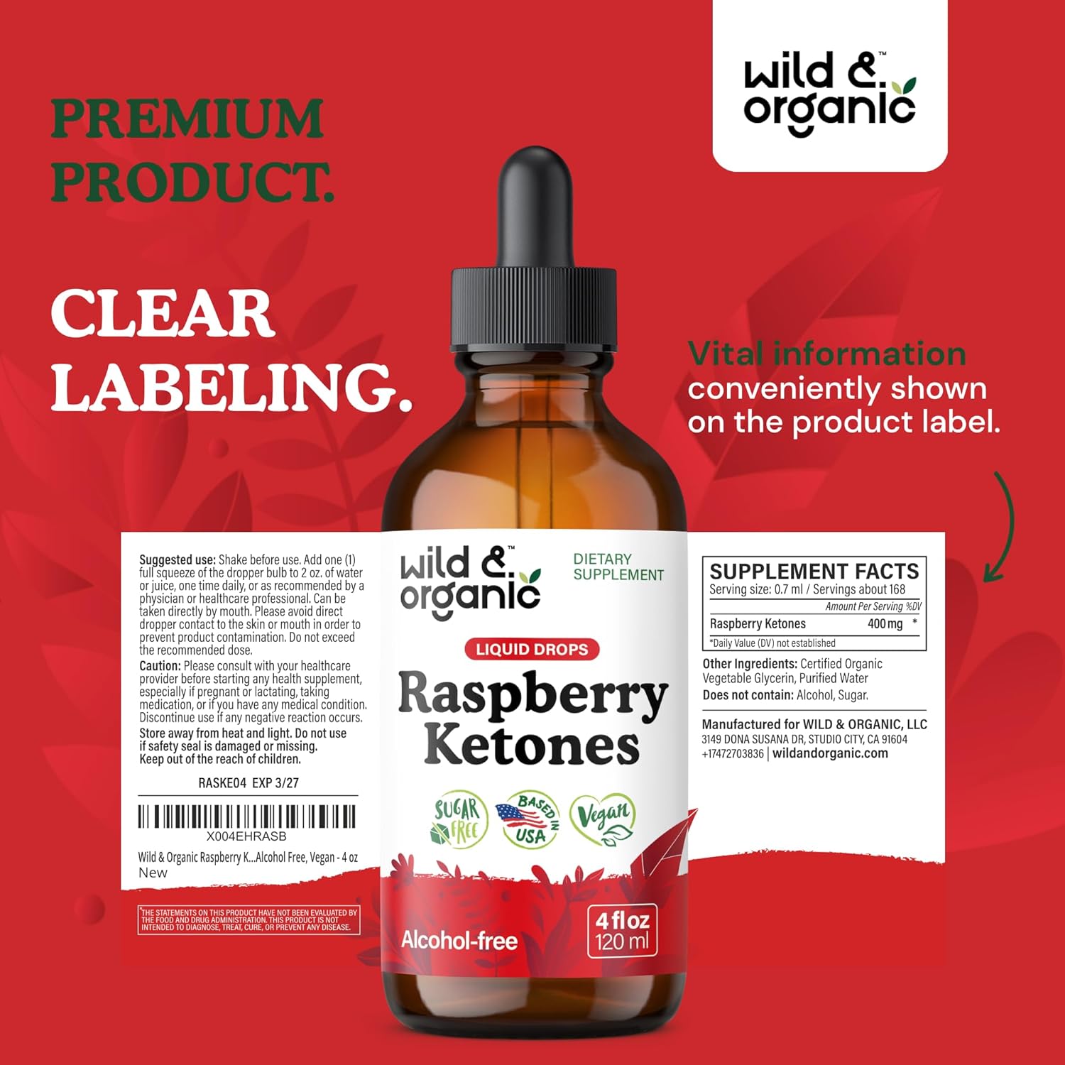 Sweetness Without Sugar: Enjoy a pleasant supplement experience with Wild & Organic raspberry ketone drops, which feature a naturally sweet taste. Our raspberry ketone supplement uses glycerin for natural sweetness, with no added sugar.